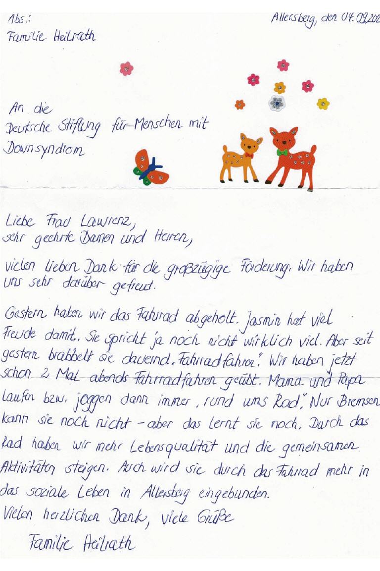 Wir, meine Tochter und ich, bedanken uns bei der Stiftung für Menschen mit Down Syndrom für diese großartige Unterstützung und werden bei jeder Fahrradtour daran denken.